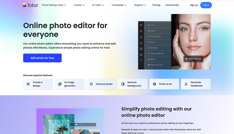 Fotor is a cloud-based photo editing and graphic design platform known for its AI tools, filters, and batch editing capabilities. It’s a go-to solution for ecommerce sellers, content creators, and individuals who need to quickly enhance photos or build simple marketing visuals without diving into complex software.